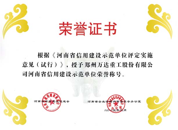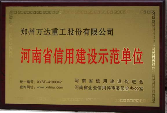 熱烈祝賀鄭州萬(wàn)達(dá)重工股份有限公司通過(guò)了“河南省信用建設(shè)促進(jìn)會(huì)”和“河南省企業(yè)信用評(píng)審委員會(huì)辦公室”共同組織的“河南省信用建設(shè)示范單位”復(fù)審認(rèn)證,被認(rèn)定為“河南省信用建設(shè)示范單位”榮譽(yù)稱(chēng)號(hào)!