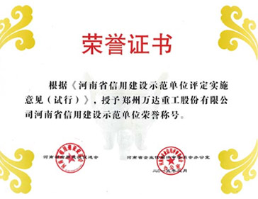 2016/01/28 428 熱烈祝賀鄭州萬達重工股份有限公司通過了河南省信用建設(shè)促進會和河南省企業(yè)信用評審委員會辦公室共同組織的河南省信用建設(shè)示范單位復審認證,被認定為河南省信用建設(shè)示范單位榮譽稱號!
