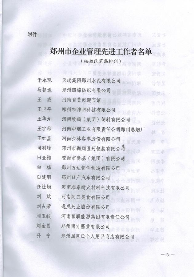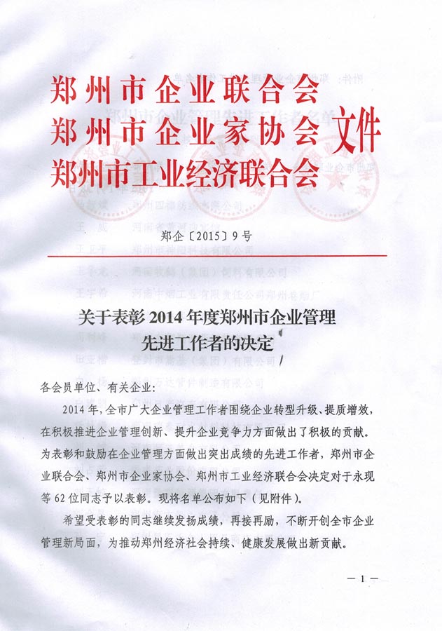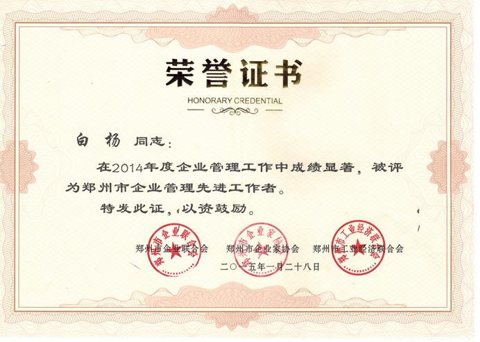 熱烈祝賀我公司白楊同志獲得鄭州市企業(yè)管理先進工作者稱號