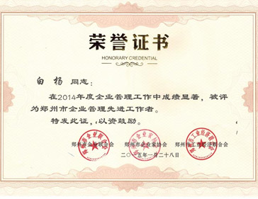 熱烈祝賀我公司白楊同志獲得鄭州市企業(yè)管理先進(jìn)工作者稱(chēng)號(hào)